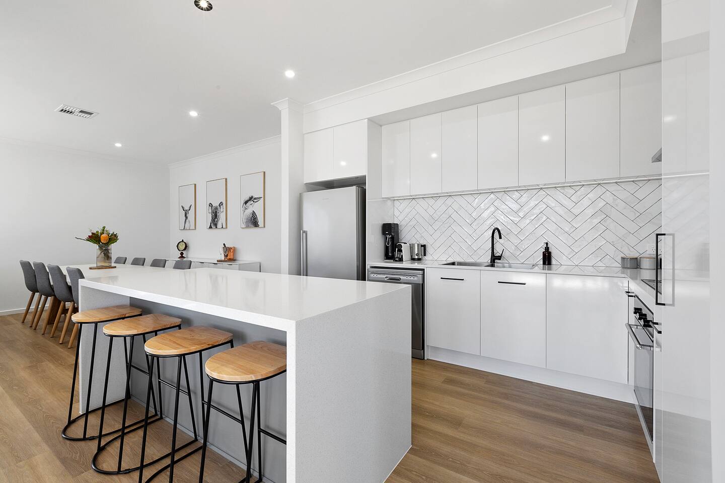 This superb holiday residence enjoys a host of high-end fixtures and fittings reflecting the desire for luxury and privacy for discerning holiday-makers, and includes:- • 1 x King size bed, 2 Queen size beds and 2x single beds • Ducted reverse-cycle air-conditioning • 8-Seater dining suite • Abundant streamlined storage space • Separate fitted laundry with washer & dryer • West-facing deck complete with overhead fan, dining table, chairs & couches • Neat front lawn & garden • Deep driveway for off-street parking Wi-Fi, Netflix, Prime Video Nespresso Machine >5 minute walk to the main street